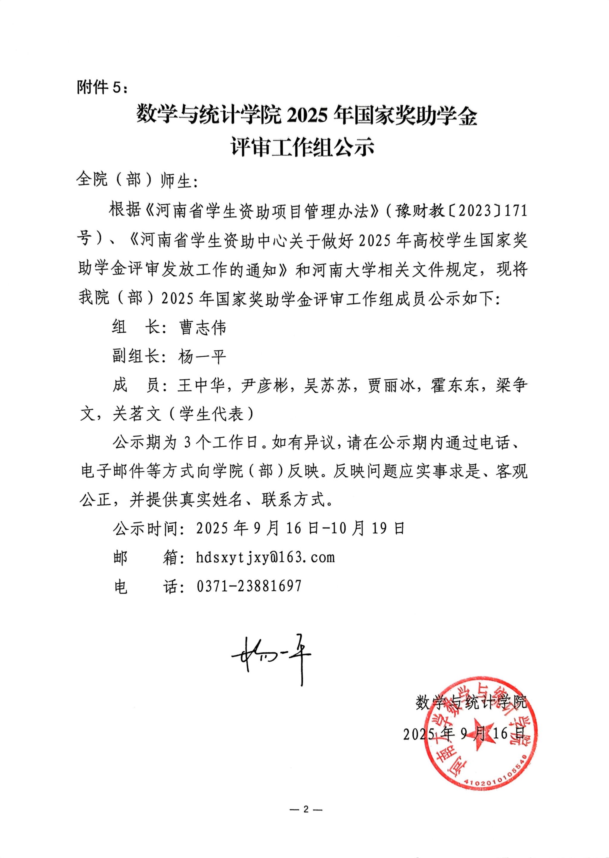 河南大学数学与统计学院2025年国家奖助学金评审工作组公示