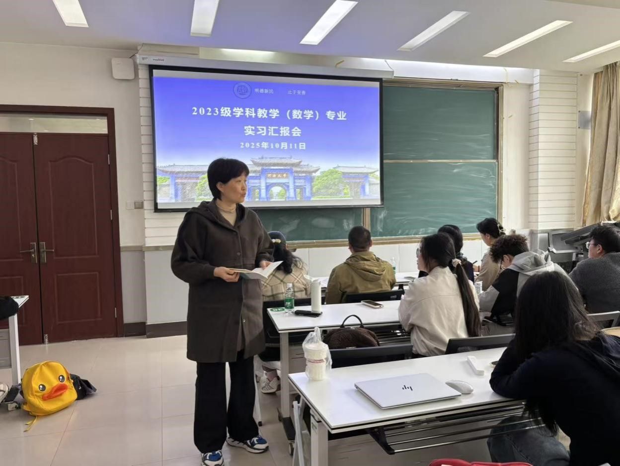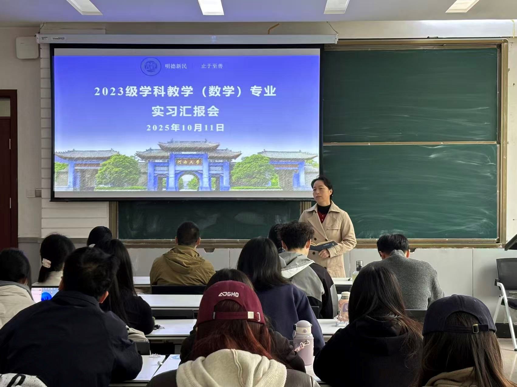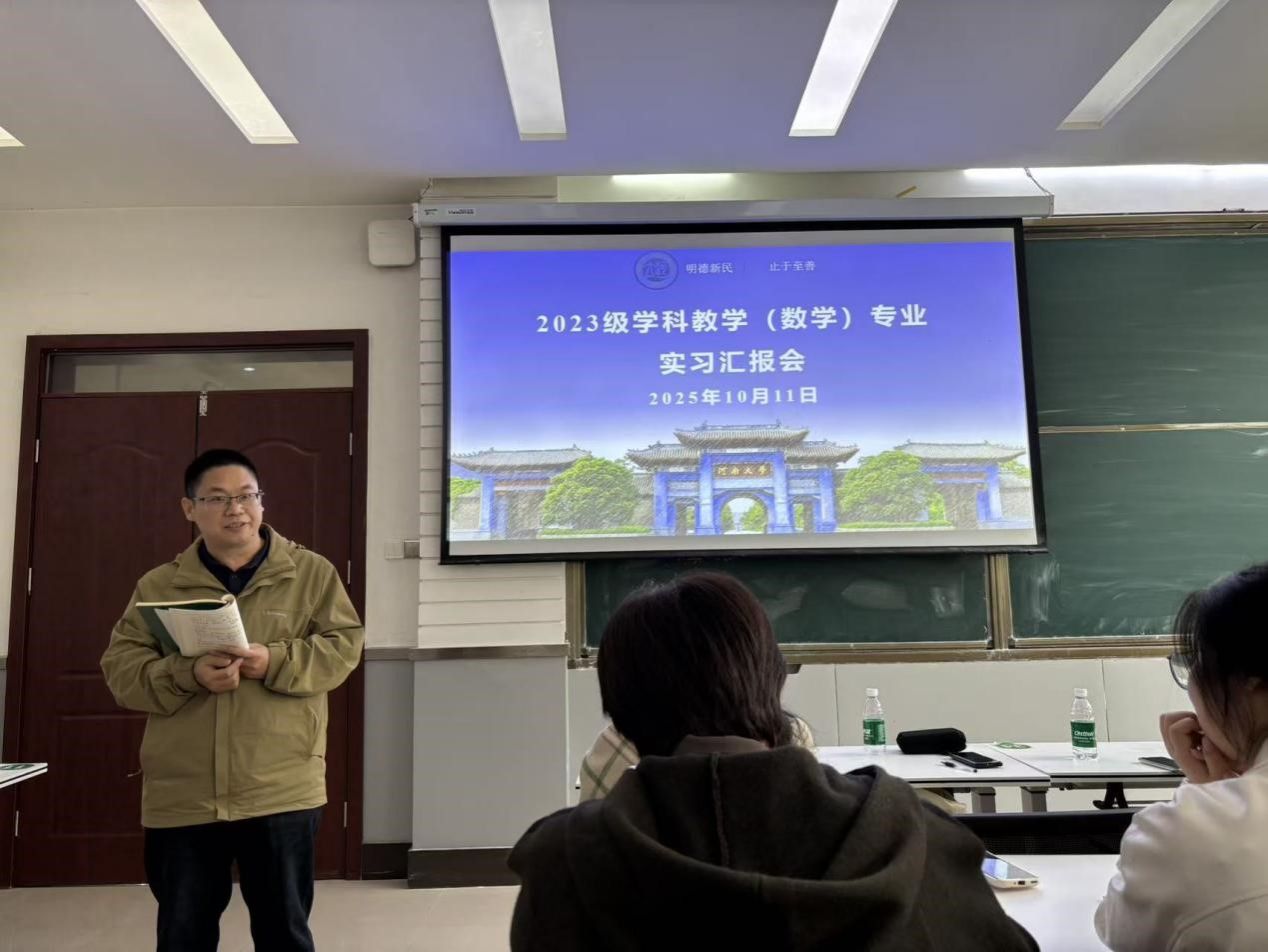 2025年10月11日上午,数学与统计学院2023级学科教学(数学)专业实习汇报会在学院一楼报告厅举行。校教师中心副主任、学科教学导师王波,学院学业导师尹彦彬、汪叶、范利萍,在校学科教学专业硕士参加了汇报会。汇报会由数学教育方向带头人张玉环主持。