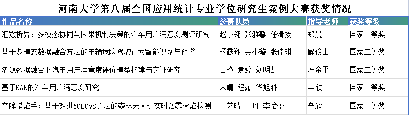 此次大赛,共吸引了全国158所高校和科研院所的1083支队伍参赛,65个案例作品参加国赛现场答辩,最终评出一等奖16个、二等奖49个。我校数学与统计学院共有8支队伍获得华中赛区奖项、5支队伍获得国家级奖项。其中,由郑晨老师指导的《汇数析异:多模态协同与因果机制决策的汽车用户满意度测评研究》获得国家一等奖,另有3支队伍获得国家二等奖、1支队伍获得国家三等奖,包揽河南省所有国家级奖项。