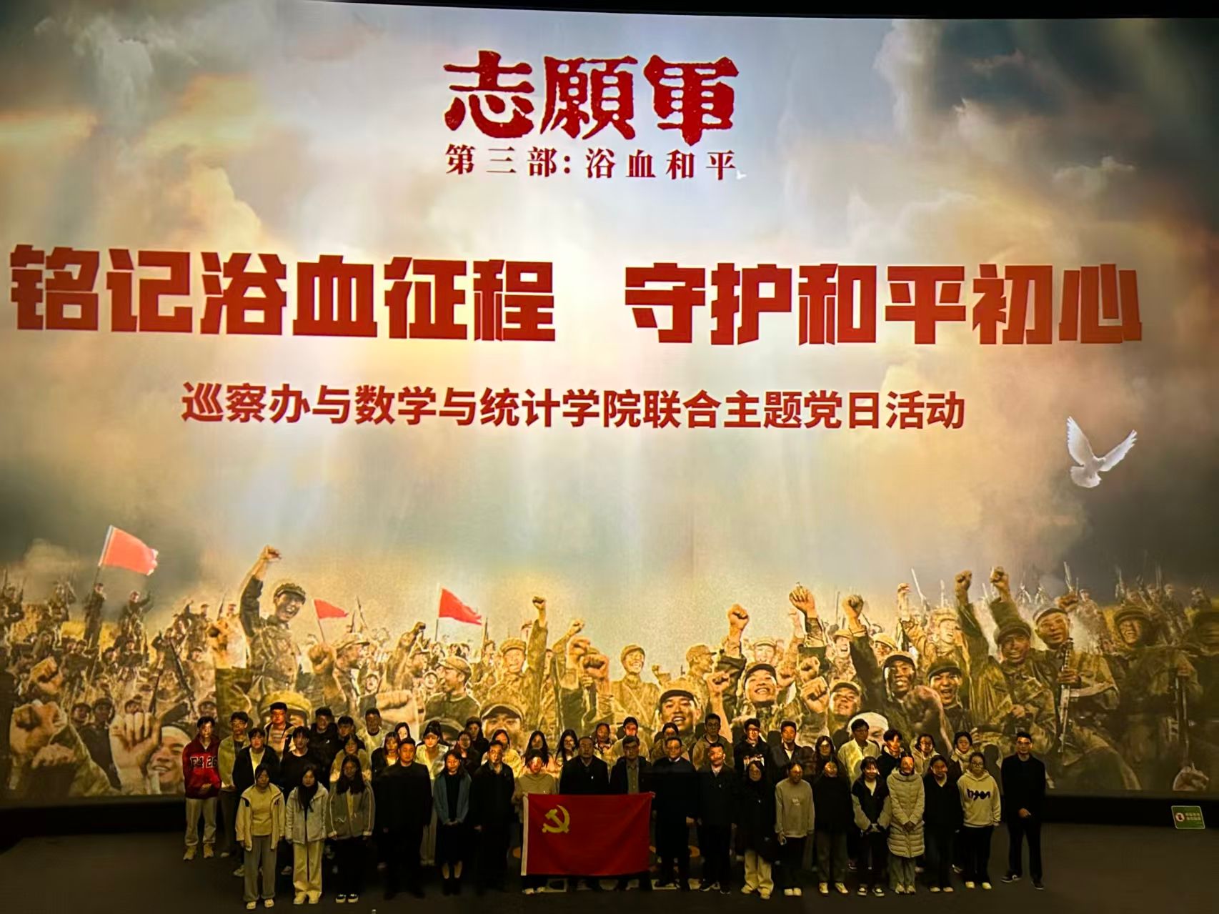 10月25日,正值中国人民志愿军抗美援朝出国作战75周年纪念日,为深切缅怀革命先烈,传承红色记忆,当日下午,巡察办党支部联合数学与统计学院党委开展“铭记浴血征程,守护和平初心”红色观影主题党日活动。双方党员、入党积极分子及党外代表人士四百余人齐聚一堂,共同观看抗美援朝题材影片《志愿军:浴血和平》,在光影中回望铁血岁月,于银幕前砥砺初心使命。