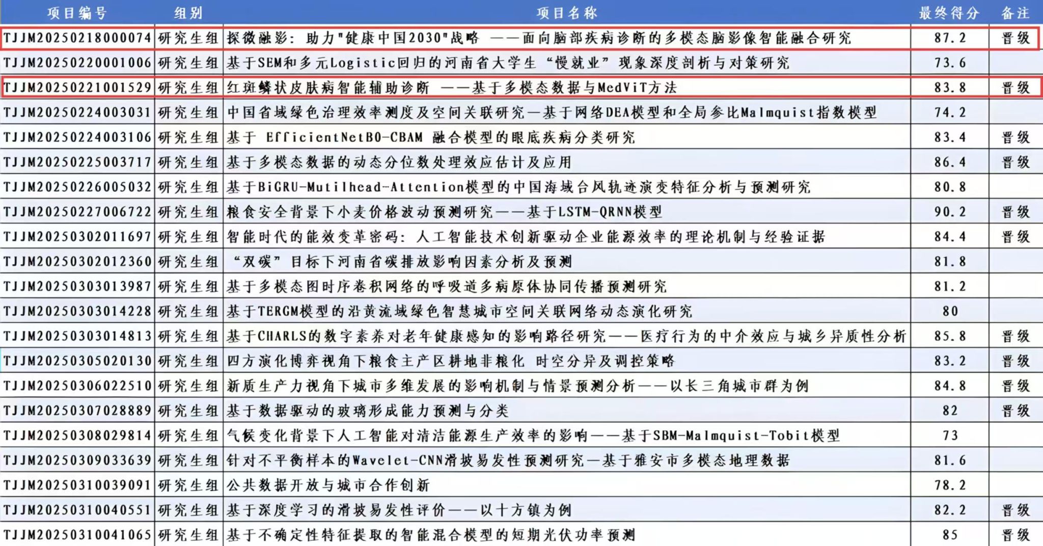 10月26日,第十一届全国大学生统计建模大赛国赛答辩赛在东北财经大学圆满落幕,我校数学与统计学院两支研究生团队凭借扎实的学术功底与创新应用能力,双双获奖。《助力“健康中国2030”战略——面向脑部疾病诊断的多模态脑影像智能融合研究》表现突出,在全国总决赛中荣获河南省唯一的国家二等奖;《红斑鳞状皮肤病智能辅助诊断——基于多模态数据与MedViT方法》荣获国家三等奖。