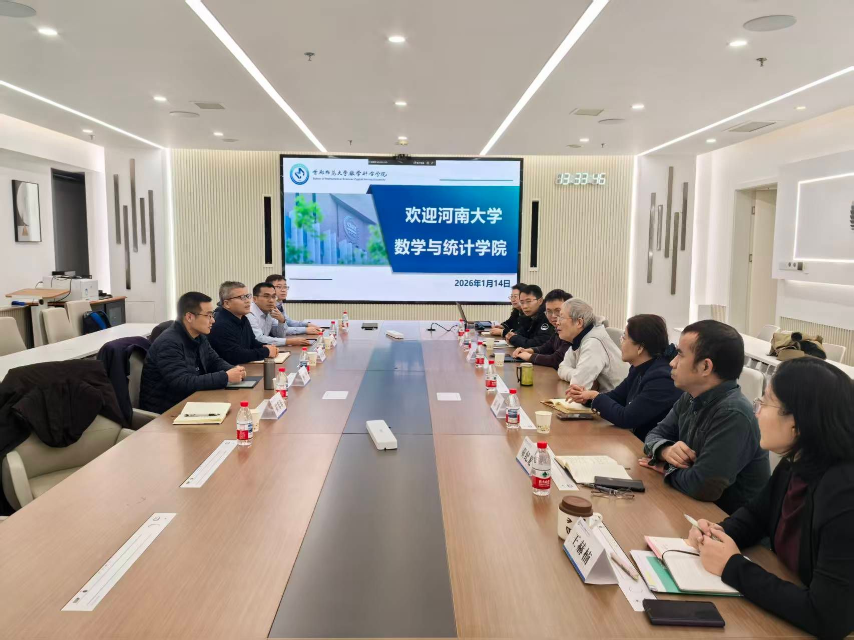 1月14日上午,调研组在中国人民大学数学学院开展交流,学院党委书记柯媛元等领导班子成员出席。双方围绕党建与业务融合、学科建设提质增效等内容座谈交流。双方重点探讨了数学在金融等交叉领域的融合发展路径,并在多个方面达成合作共识,为后续深入协作奠定基础。当天下午,调研组赴首都师范大学数学科学学院交流,学院党委书记高蓉、院长张振雷等出席。张振雷系统介绍了学院发展历史、学科建设成果和人才培养成效。双方就师资队伍建设、课程体系优化等共同关心的话题进行了深入讨论。