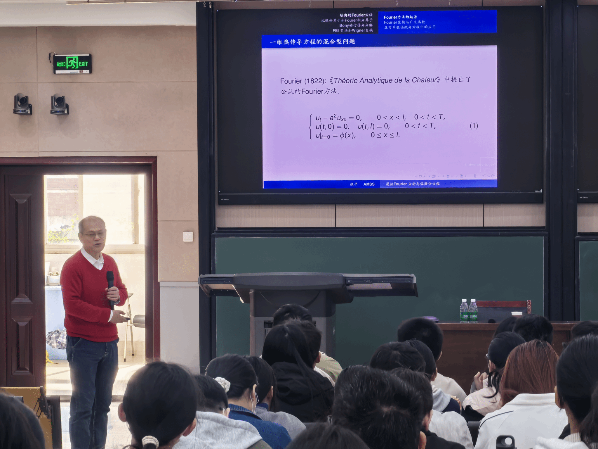 张平院士以Fourier分析为核心,介绍了Fourier级数与变换的基础理论及其在常系数偏微分方程中的经典应用,阐述了拟微分算子的理论框架与在变系数方程、双曲组问题中的应用,讲解了Littlewood-Paley分解、Bony仿微分分解对非线性偏微分方程的处理价值,最后延伸至FBI变换、Wigner变换和半经典测度,及其在量子力学、薛定谔方程半经典极限等微局部分析领域的应用,系统呈现了Fourier分析在现代偏微分方程与微局部分析中的完整理论与应用脉络。
