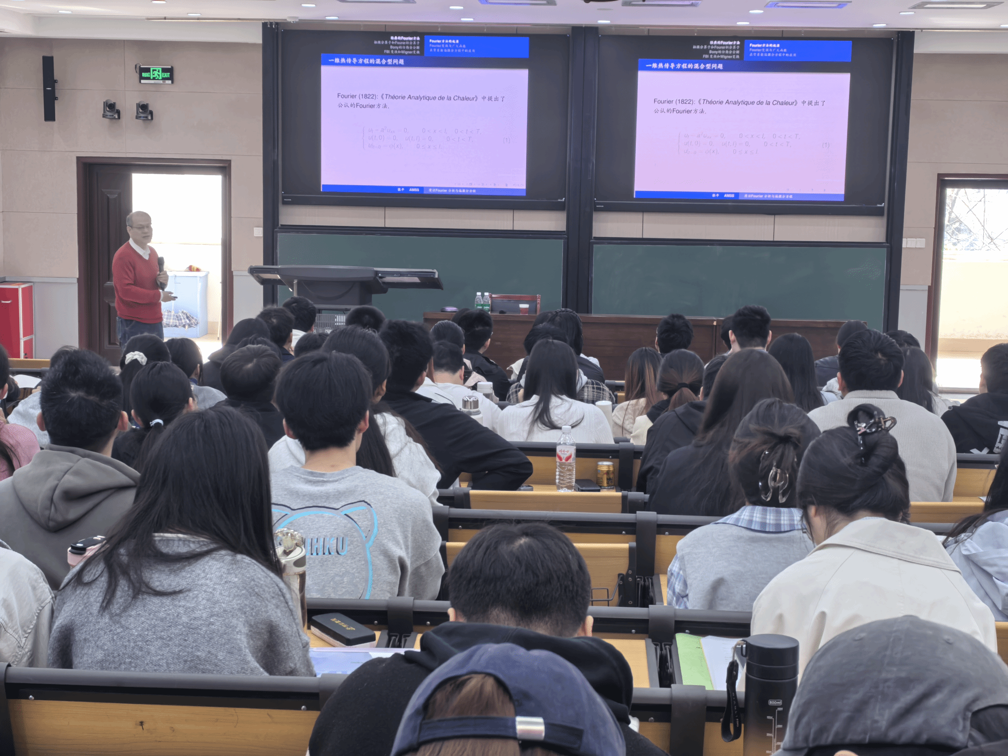 报告中,张平院士谈及Fourier为求解热传导方程提出的“三角级数展开理论”,指出该理论虽一度引发学界争议,却为Fourier分析奠定了基础,并成为偏微分方程求解的核心工具之一;他同时强调,原始创新是数学发展的核心动力,科研应勇于突破、深耕原创,减少跟风式研究。此外,张平院士还阐述了精读经典的重要性,倡导师生通过研读原著、相互讲授夯实数学基础,并回顾了广义函数理论引入国内的历程,让在场师生深切体会到老一辈学者的治学奉献精神。