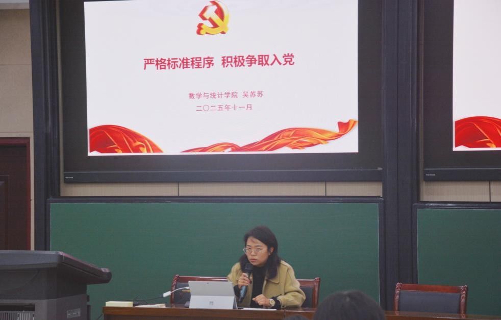 党课第二讲由学院党办主任吴苏苏主讲。她围绕党员发展工作专题展开,系统阐述了发展党员工作的总体要求。课程详细讲解了从申请入党到转为正式党员的完整基本程序,包括培养教育、考察确定、预备期管理等各个环节的具体要求和规范流程,为学员们明晰了努力方向和成长路径。